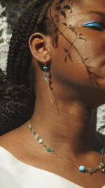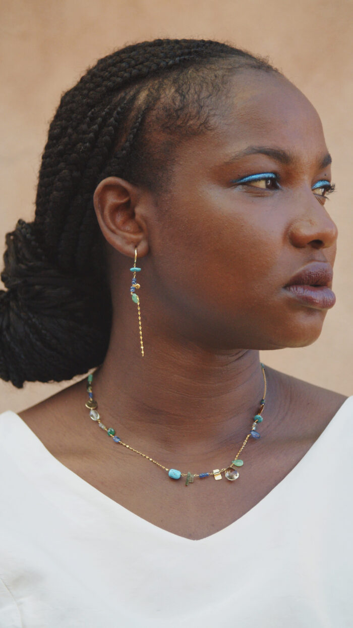 This selection is wearing all the colors of the rainbow and reminds us of a misty morning when the flowers are just about to open up again. Our golden selection contains hand-picked delicate and timeless designs made in Greece. Elegant and modern 14k solid gold necklace with different semiprecious stones in unique organic shapes. This necklace carries lemon quarts and tourmalines. We do have matching earrings if you like to make a set.