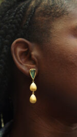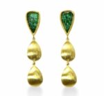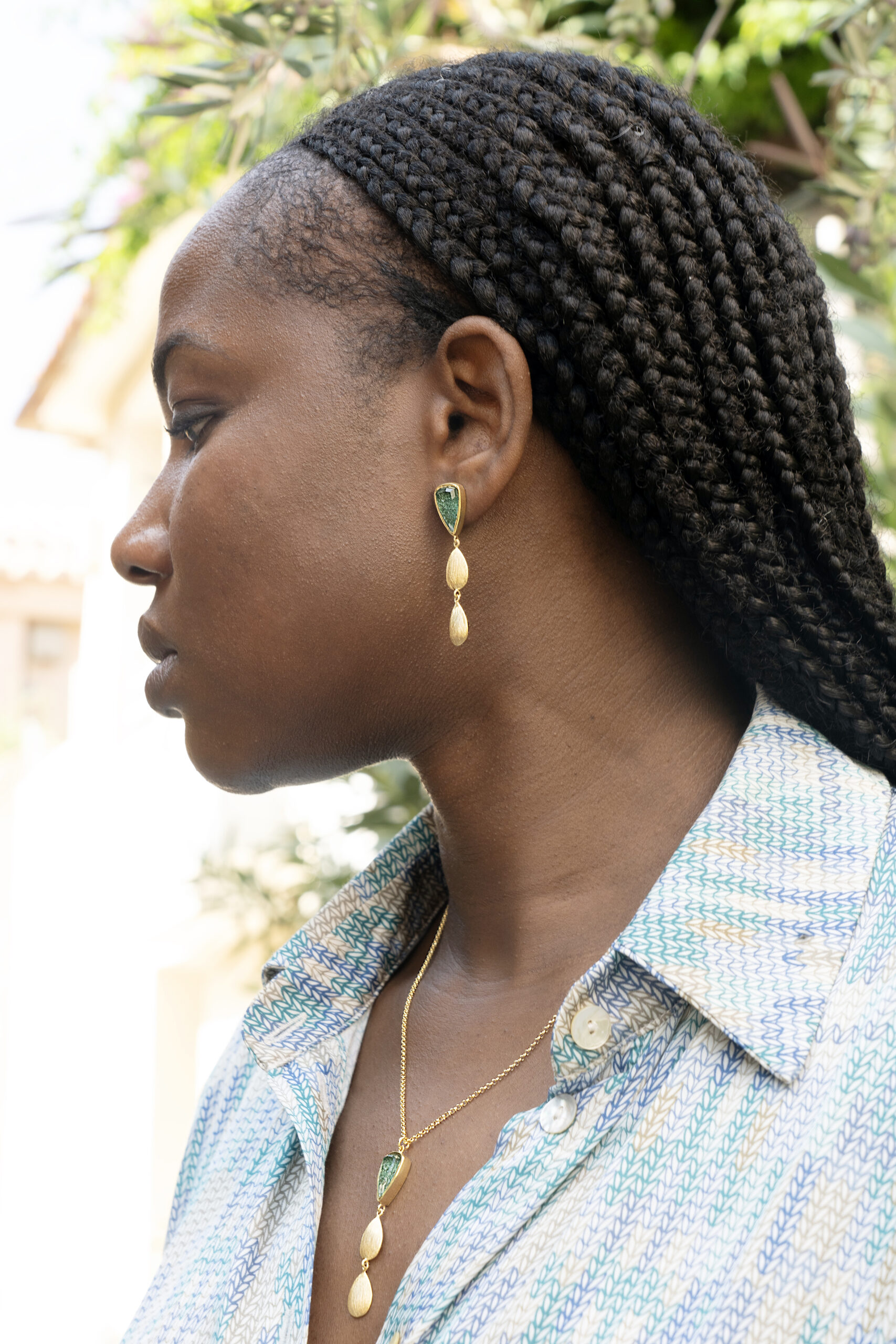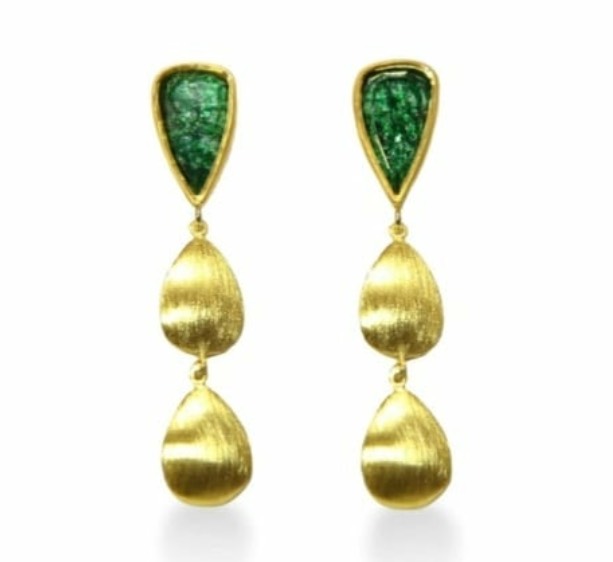 A new selection has arrived at Vergina Gallery! These are the finest quality stones that you would find in a silver setting. This artist combines straight, solid lines in a minimalistic frame, giving a place for nature to shine with her beautiful stones.  Perfect balance between design and nature. These earrings are made of gold-plated silver 925 and amazing fuschite quartz stones.