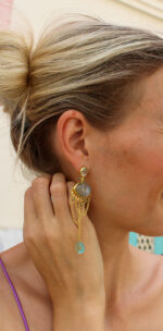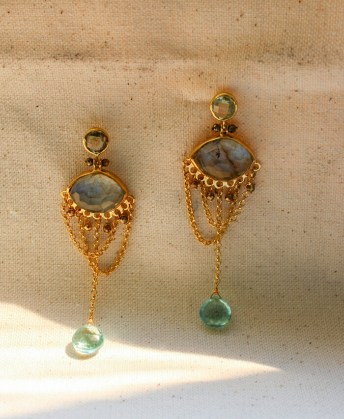 These designs are part of our favorite selection of occasion wear. It is romantic and feminine, featuring freshwater pearls, bright gemstones, and swirling elements. These wonderful statement earrings are made of prasiolite, labradorite clear quarts, of gold-plated silver 925. Handmade in Athens by one of our favorite workshops.
