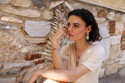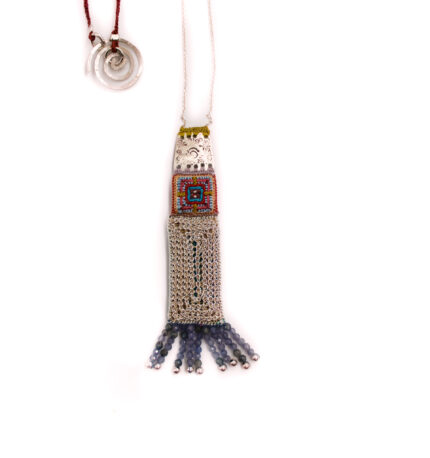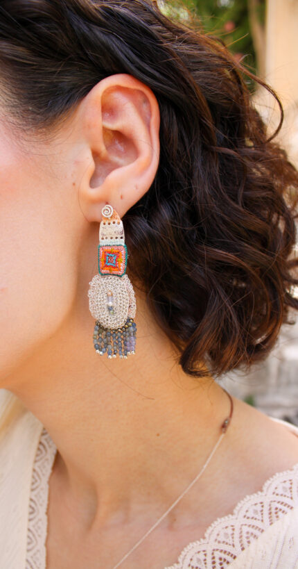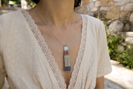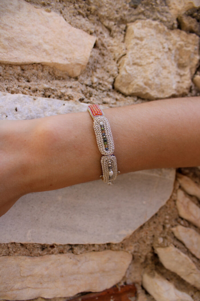 Embrace the mystique of ancient tales with our folklore collection! Made at the island of Rhodes, Greece. Crafted with luxurious patchwork silk, intricately woven into hand-knitted silver 925, some adorned with shimmering semiprecious stones.