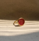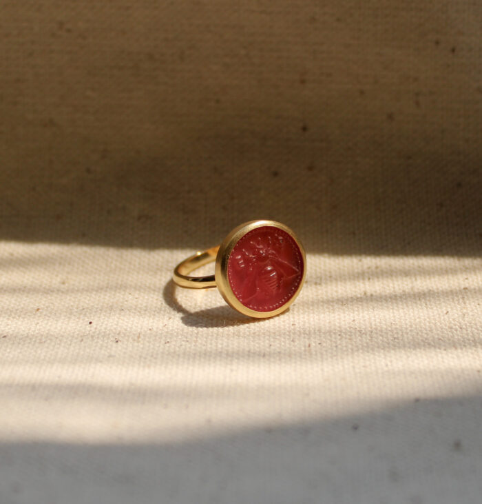 Unisex pieces, expertly hand-carved coins adorned with solid gold, featuring iconic symbols from Ancient Greek Mythology, such as the bee, the owl, the centaur, etc. The gallery’s diamond workshop makes our heritage selection, so we can understand that it is crafted with great knowledge. This ring is made of 14 karats of gold and a fantastic hand-carved cornelian stone with the bee symbol. The gold setting around the stone is in mate finish and the band is polished.