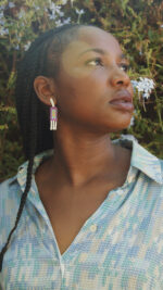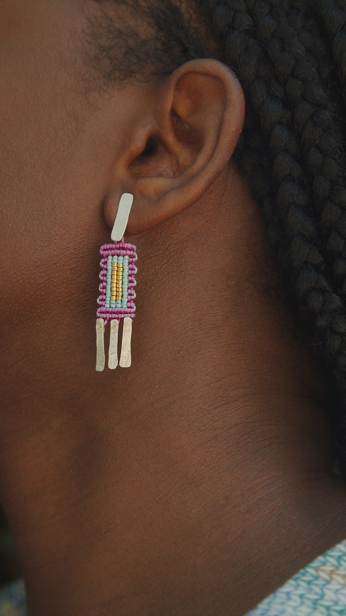 Choose between turquoise-colored macramé with silver, deep red-colored macramé with oxidized silver or purple as the model is wearing.