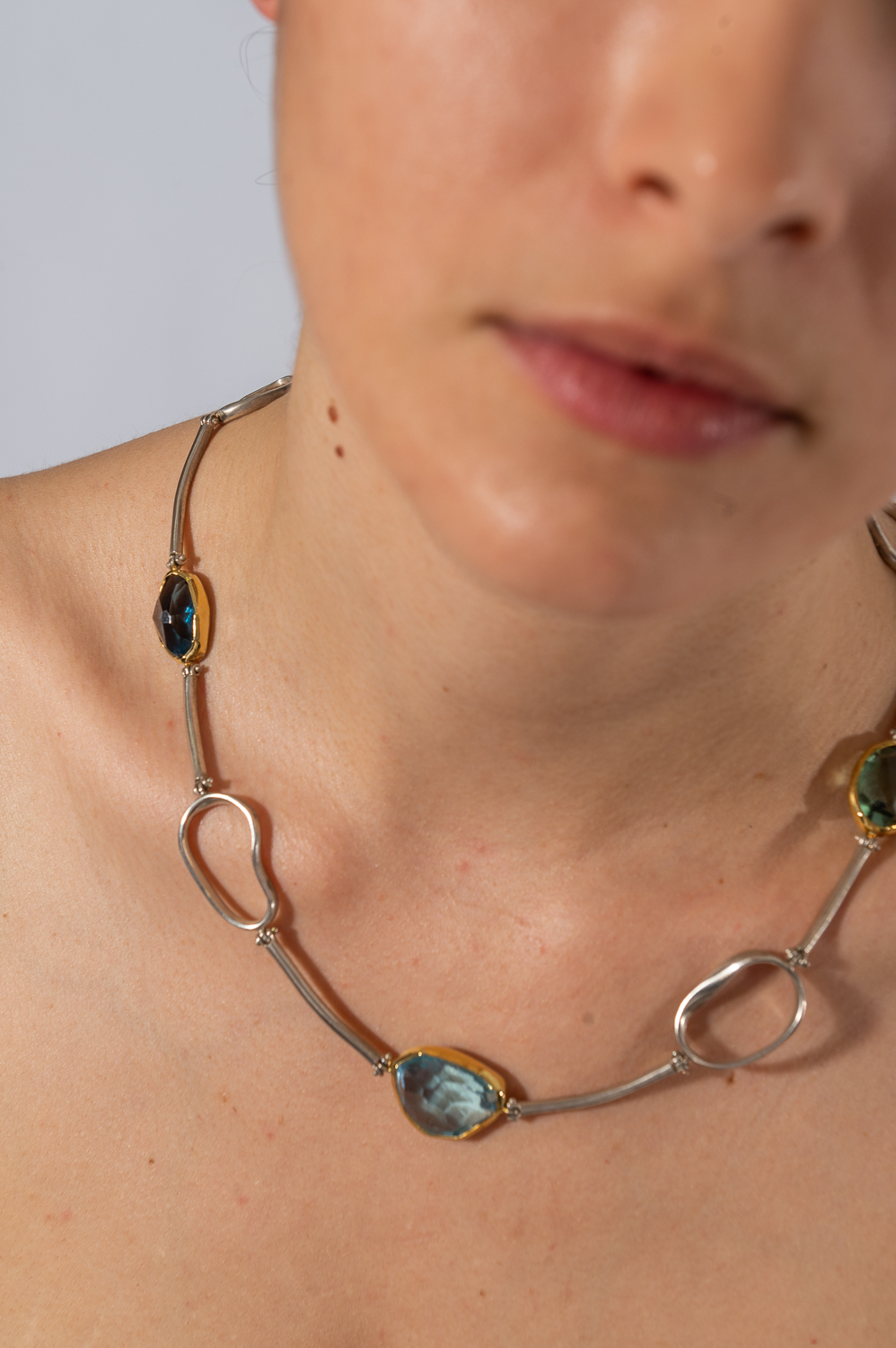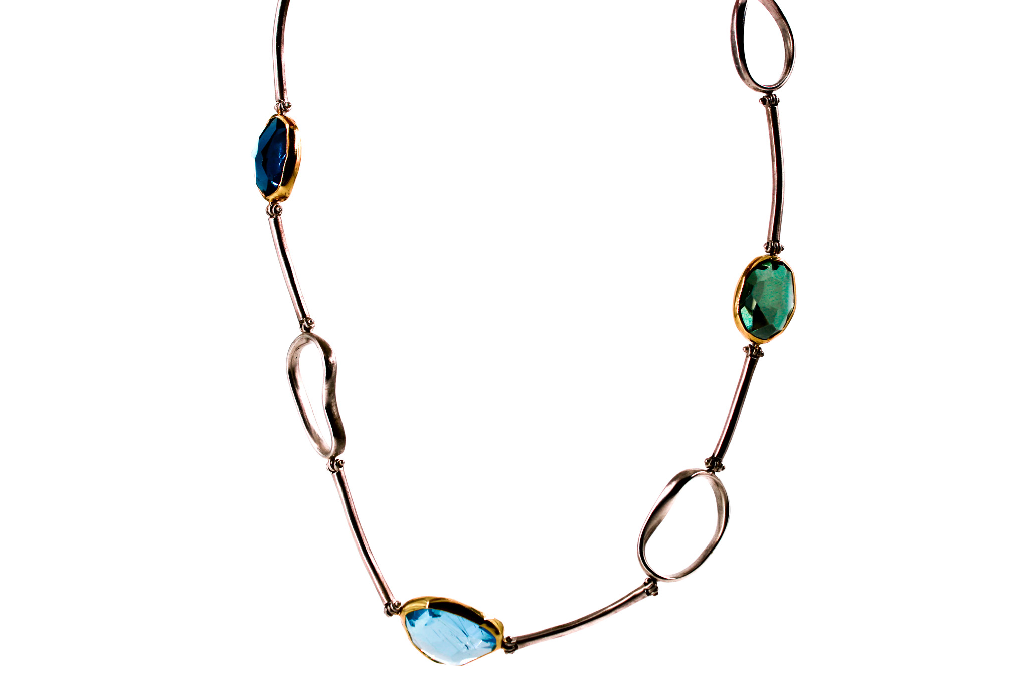This necklace has beautiful stones of Aqua Marine, Topaz, Amethyst held by 18 k solid gold and silver 925.